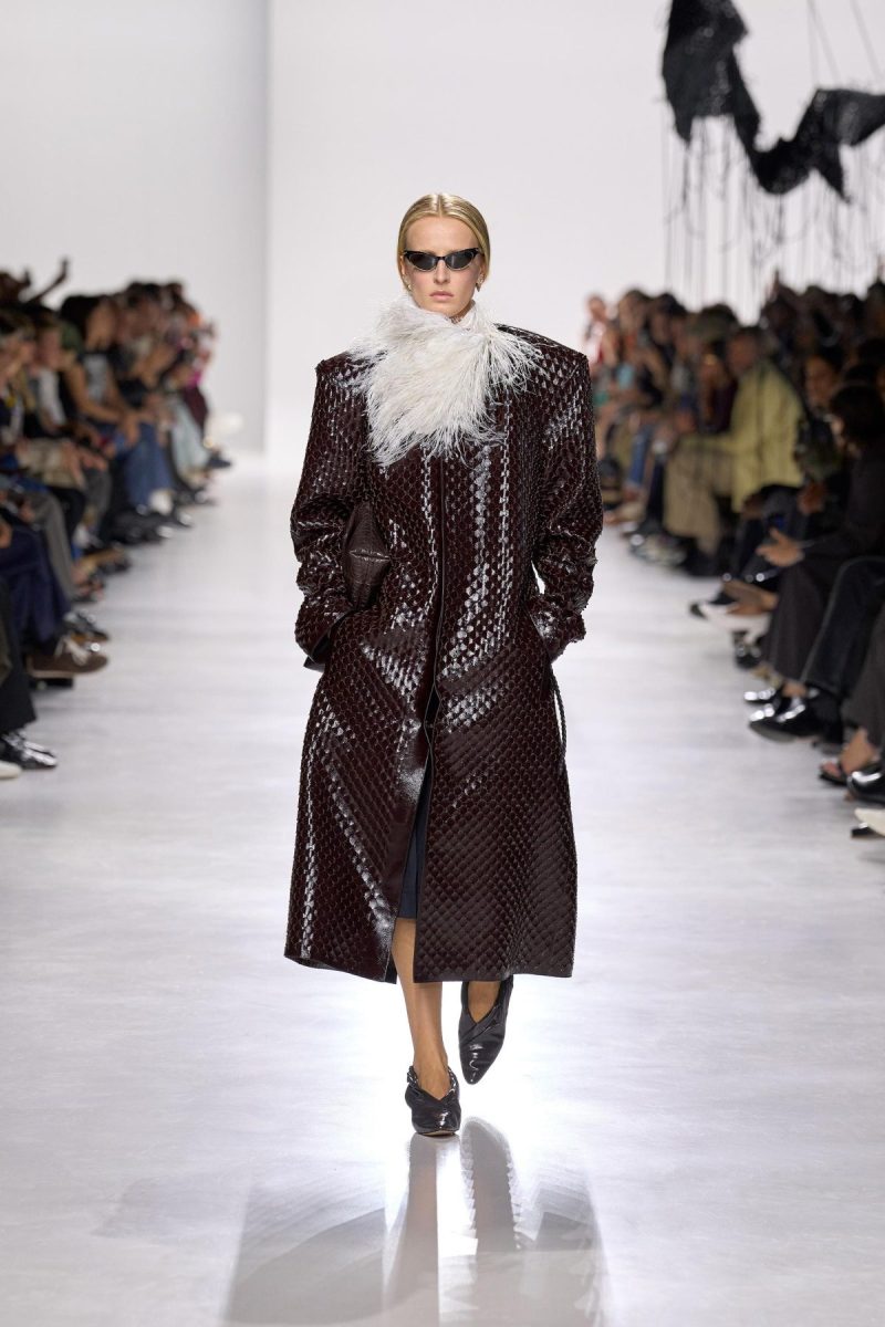L’inglese di Sunderland, fattasi notare con le sue precedenti direzioni creative – Lacoste e Carven – non ha deluso le aspettative, pur altissime dopo il percorso di ripensamento di Bottega Veneta operato da Blazy e da Daniel Lee prima, con una collezione che è una dichiarazione d’amore all’intrecciato della maison vicentina. Alla presenza di un parterre di celebrities che vanno da icone del passato – come Lauren Hutton, da cui l’omonima borsa, per questa stagione rivista nelle proporzioni – a attori del presente, come la testimonial Julianne Moore e Tramel Tillman, l’intransigente capo ufficio Seth Milchik in Severance, sfilano trench in nappa strutturati e abiti da seta in cotone leggero. Il vero cuore pulsante della sfilata però, è nelle lavorazioni della pelle, tramutata in tessuto fluido, corporeo, capace di seguire con una certa morbidezza i movimenti di chi lo indossa: un omaggio a quella “soft functionality” la cui religione era professata da Laura Braggion, prima direttrice creativa del brand tra gli anni ottanta e l’inizio dei duemila. Così sfilano cappotti dai volumi maxi, dove persino le cinture in vita sono in intrecciato; sciarpe in pelle da appoggiare al collo, con frange sulle estremità; cappotti decorati da maxi nappe; vestiti al ginocchio sui quali i volumi della pelle sono educati a creare vuoti e pieni che esaltano una femminilità raffinata.