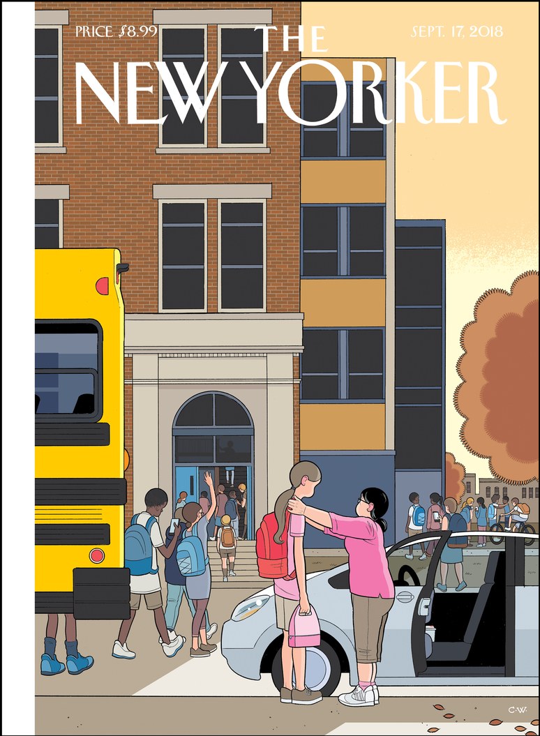 A rendere tutto ancora più toccante, è il fatto che già nel 2012 Ware aveva già dedicato una copertina al tema del ritorno a scuola, quando sua figlia Clara aveva sette anni: in questo caso la bambina, ancora piccola (riconoscibile per lo stesso zaino rosso e la stessa maglietta rosa) si guardava indietro sperduta, mentre il gruppo dei genitori si allontanava sereno. Ma c’è un’altra copertina di Ware sullo stesso tema, la più forte: riflette le sensazioni provate accompagnando sua figlia a scuola dopo le vacanze di Natale del 2013, a poca distanza dalla notizia della sparatoria che uccise 20 bambini nella scuola elementare di Sandy Hook in Connecticut.