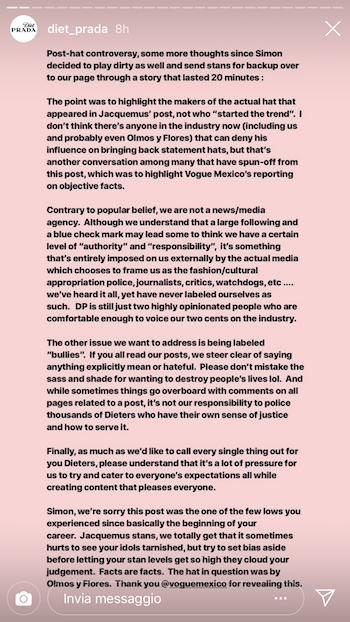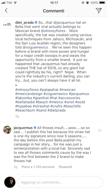 È un tema fondamentale, una di quelle conversazioni culturali che sta già spingendo e spingerà sempre più l’industria a rimodularsi dall’interno, facendo emergere finalmente nuove voci, visioni, punti di vista. Ne abbiamo parlato quando Naomi Campbell ha paventato l’idea di un eventuale Vogue Africa e a proposito del lavoro che Alessandro Michele sta facendo da Gucci, ad esempio, ma il rischio di appiattire il discorso a sterili dicotomie esiste. Si pensi a quello che fanno, su Instagram ovviamente, account come Diet Prada, aizzatori delle folle degli “appassionati” di moda: le loro polemiche ormai non si contano. Jacquemus condivide una foto di Bella Hadid sulla copertina di Vogue México con un cappellone che ricorda molto quelli della sua collezione La Bomba, li avrete visti, il fast fashion ne è pieno ed è da lui, a dirla tutta, che ri-nasce quell’ossessione per quel generico stile “franco-provenzale” che impazza oggi da Jeanne Damas (l’amica influencer) in giù. Lo stesso stile che, immaginiamo, renda Macron molto orgoglioso, lui che si batte per un made in France che poi è made in Italy. È una foto d’ispirazione, dice il ragazzone di Marsiglia, fa parte del “mood” del suo profilo, rigorosamente a tre a tre, è appropriazione, dice invece la fashion polizia, perché il cappello è di un marchio messicano e lui non l’ha scritto, e i messicani, lo sanno tutti, intagliano la paglia e portano grandi cappelli, dovresti saperlo anche tu razza di appropriatore francese, valli a spiegare che pure in Salento si intaglia la paglia e le borse che fanno ad Acquarica del Capo sono tali e quali a quelle della Damas e magari anche che, forse eh, “i messicani” avrebbero bisogno di essere contestualizzati meglio.