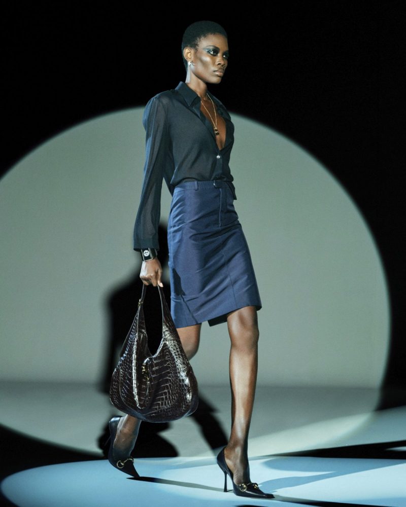L’eco più riconoscibile è quello degli anni di Tom Ford (1994–2004), che riaffiora nei tailleur taglienti, nelle pencil skirt e in certi look maschili che sembrano usciti direttamente da un album di David Beckham in transito a Heathrow. A questo si somma una massiccia presenza della Dionysus, introdotta da Alessandro Michele nel 2015, oggi riportata in trionfo, insieme a un pizzico di Flora by Frida Giannini e a stampe animalier anni ’70.