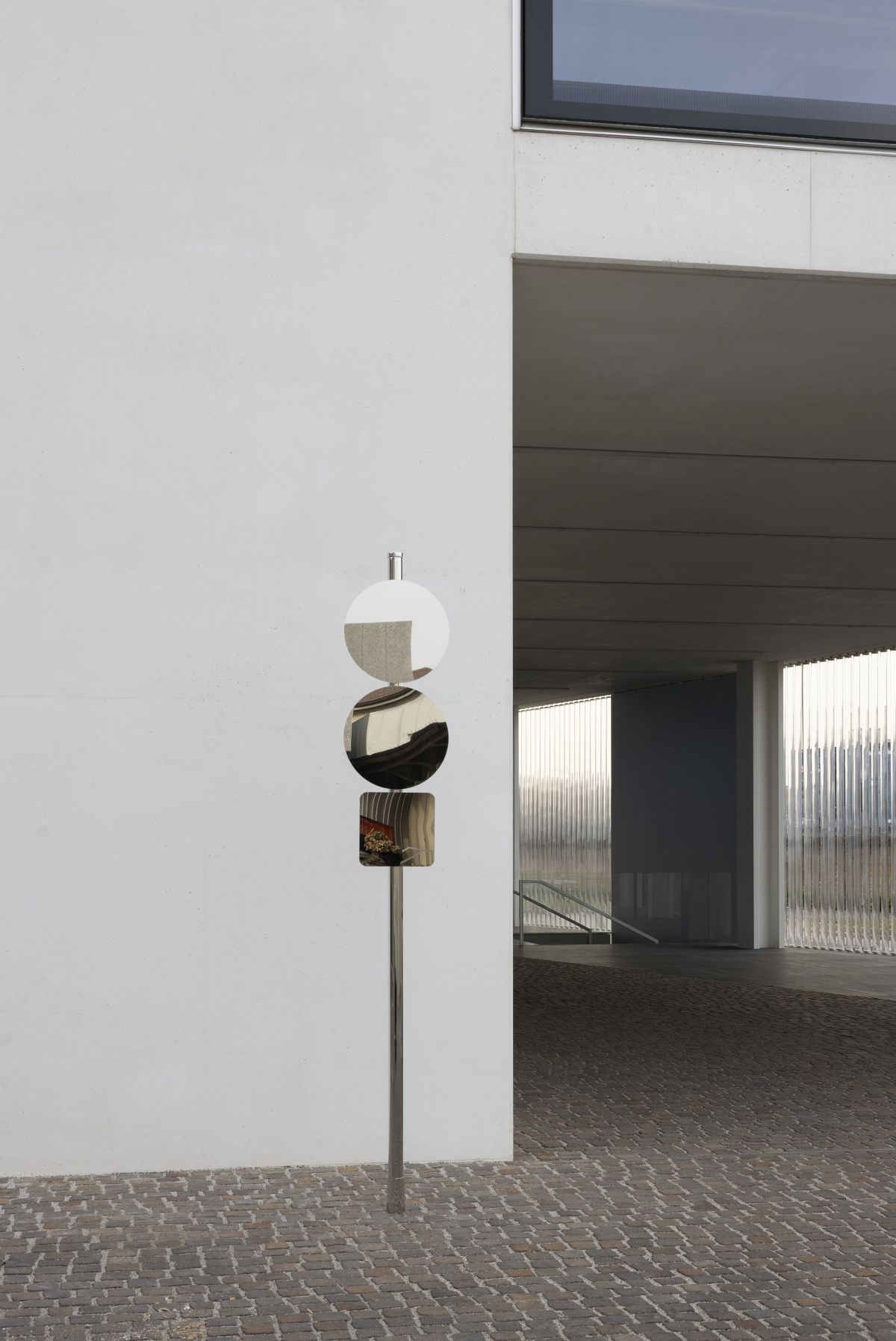 ⓢ E a proposito di corpi e società: la mostra è disseminata di segnali stradali che però non indicano nulla, sono degli specchi.
