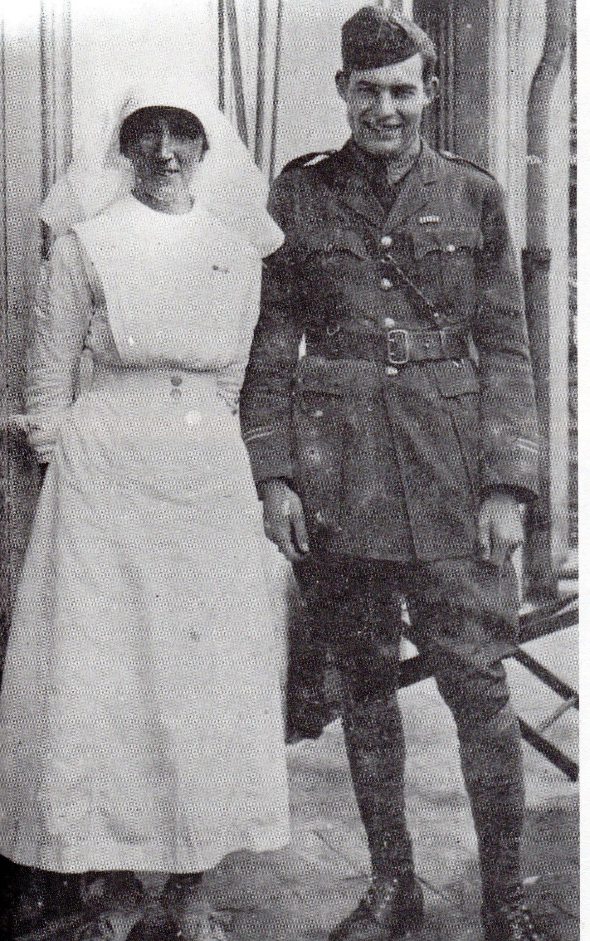 - Hemingway e l’infermiera inglese Agnes Conway, foto scattata all’ospedale della Croce Rossa Americana di Milano e ritrovata da Giovanni Cecchin a Villa Ca’ Erizzo. Foto inclusa nell’Album donato nel 1924 dal volontario della Sezione Uno, Harry Knapp, alla famiglia Azzalin, ex proprietari di Villa Ca’ Erizzo.