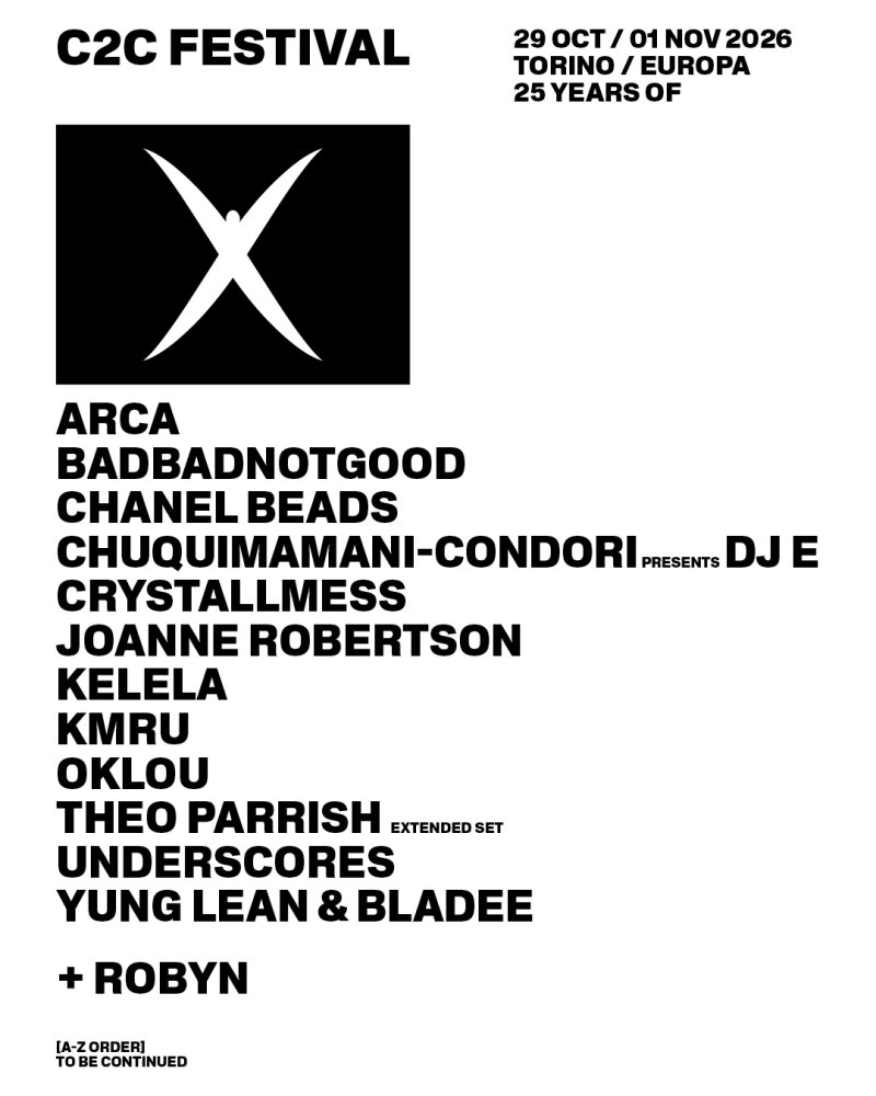 Protagonista assoluto di questa edizione sarà lo show di Robyn, il cui nuovo attesissimo album, Sexistential, uscirà il 27 marzo (a 7 anni dall’ultimo lavoro di solista). A entusiasmare i primi commentatori della line-up però è stata soprattutto la presenza degli svedesi Yung Lean e Bladee, per la prima volta insieme in Italia, e della producer francese Oklou, il cui album del 2025 Choke Enough è stato considerato uno dei migliori dell’anno. Attesissimo il ritorno di Arca e quello, a oltre dieci anni dall’ultima apparizione, di Kelela, una delle voci più raffinate e visionarie del panorama R&B contemporaneo. Chuquimamani-Condori, Leone d’Argento alla Biennale Musica di Venezia, sarà a C2C Festival con il suo progetto DJ E: reduce dal memorabile show con il fratello Joshua Chuquimia Crampton come Los Thuthanaka, in questa veste affronta il djing combinando cacofonia sonora, vulnerabilità emotiva e sovrabbondanza di texture. Tra i live più attesi ci sono anche quelli di BADBADNOTGOOD, quartetto canadese che esplora i versanti più avventurosi e ibridi del jazz e ha collaborato con artisti come Kendrick Lamar, Tyler, The Creator e Frank Ocean; e Chanel Beads, progetto che ruota attorno ad una delle figure chiave della scena DIY newyorchese, Shane Lavers.