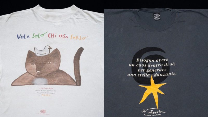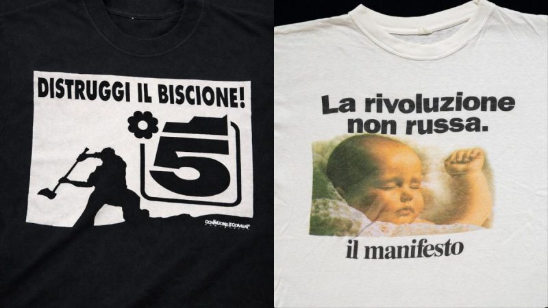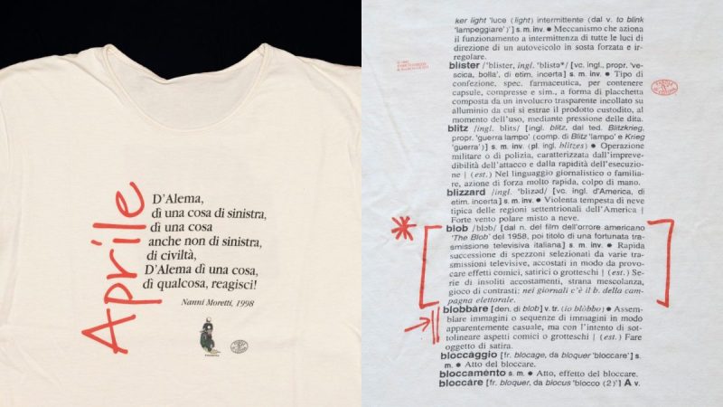 Le magliette degli anni Novanta non erano però politiche soltanto a causa del messaggio, esplicito, stampato sul lato frontale. Appartenevano, per così dire, a un’area politica che in quegli anni (e decisamente non più) godeva di un’evidente egemonia culturale. Per esempio, le magliette dei programmi televisivi: come Blob, il format di culto di Marco Giusti ed Enrico Ghezzi, che celebrava sul retro la definizione del dizionario Zingarelli “blobbare”, fondamentale segno dei tempi. Rimanendo nel mondo dei media, c’è la storica maglietta con un neonato in fasce e il payoff “La rivoluzione non russa”, icona del quotidiano comunista il Manifesto. E tutto un filone legato ai libri, alla filosofia, a una cultura popolare ma non volgare (vogliamo dirlo? Sì, un po’ radical chic) che veniva espresso al meglio dal marchio “Parole di cotone”. «Parole di Cotone è il brand quintessenziale per quanto riguarda le magliette in Italia negli anni Novanta, è legato a una cultura sia molto pop che alternativa. Alcuni dei design delle magliette sono estremamente iconici, rimasti nella memoria collettiva», spiega Mapelli, che ha rintracciato uno dei fondatori del brand. «Si chiama Marco Mottolese, ha fondato il brand insieme ad altre due persone. Parole di Cotone era nato come un esperimento: per mettere citazioni di libri con delle grafiche su delle magliette. Dai libri sono passati alla musica, al cinema e alla televisione. Negli anni hanno collaborato con Nanni Moretti, Alessandro Baricco, Enrico Ghezzi, sempre per realizzare magliette collaborative. Quella di Blob era stata fatta come risposta al cosiddetto Editto Bulgaro, quando Berlusconi minacciò la chiusura proprio di Blob. La maglietta veniva distribuita anche fuori dai licei».