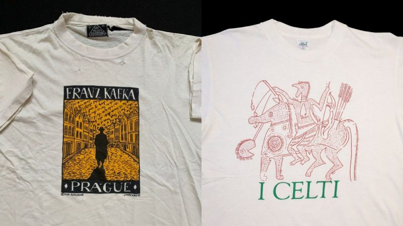 Fin qui si è detto di musica, politica, spettacolo e film. Ma le magliette degli anni Novanta erano anche souvenir di mostre e musei, alternative indossabili ai post o alle stories che oggi scattiamo ai quadri o alle statue, con lo stesso significato, però: ci sono stato, sono identificabile con questo tipo di arte, ecco il mio posizionamento sociale. «Ho nella collezione un po’ di pezzi molto rari. Per esempio di una serie di mostre a Palazzo Grassi, che all’epoca era di proprietà degli Agnelli, su antiche civiltà: Celti, Greci, Fenici. Il merch era curato da Best Company. In generale le magliette delle mostre sono tra quelle più ambite e ricercate. Ci sono degli artwork relativamente particolari, di solito, e il logo dell’istituzione aggiunge qualcosa di prezioso». Anche le magliette da viaggio, turistiche, hanno il loro ritorno. Nascono anche loro come souvenir di posizionamento sociale – «Erano sintomo tessile del fatto che avevi viaggiato, che avevi vissuto: la T–shirt di New York si poteva comprare solo se a New York ci eri effettivamente andato», dice Matarrese – ma oggi assolvono a una questione quasi esclusivamente estetica.