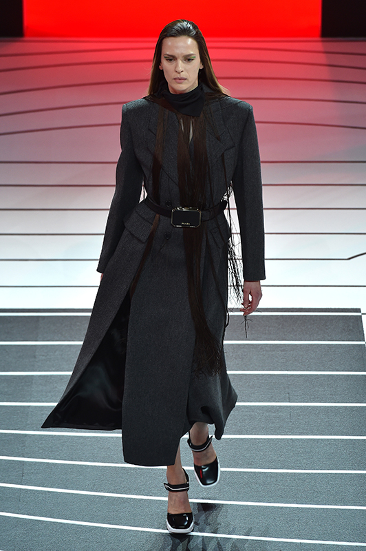 C’erano frange, esagerate, anche da Bottega Veneta, dove Daniel Lee ha costruito uno show monocromatico illuminato dai misurati tocchi di colori acidi, dai contrasti tra le giacche corte degli uomini e quelle lunghissime delle donne, e dai molti accessori, come gli stivali e le maxi borse, che promettono di consolidare il nuovo corso del marchio. E c’erano frange da Miuccia Prada, sin dalla prima gonna da educanda tagliata al laser fino ai cappotti da sera preziosi: anche lei ha riflettuto sulle donne, e sulla femminilità, e sulle donne che portano il peso del mondo sulle loro spalle come Atlante (presente al centro della piazza immaginaria che faceva da set alla sfilata). Donne al comando, severe dominatrici di se stesse e degli altri, ritornate con prepotenza nell’immaginazione degli stilisti. In Consenso, Saskia Vogel ne faceva un ritratto intimista e sfuggente, senza soffermarsi troppo sui dettagli più comunemente associati al mondo Bdsm e indagando una scena, quella di Los Angeles, che sembra aver poco di cavernoso e molto a che fare con la vastità dell’oceano e la possibilità di perdersi. Le donne di Prada sono invece molto europee, con le loro giacche anni Quaranta e le loro cinture attrezzate in vita (cosa ci entra in quei mini contenitori? Il rossetto, l’accendino, forse le sigarette sfuse). Chissà come le ritroveremo a settembre, quando debutterà la prima collezione disegnata insieme a Raf Simons.