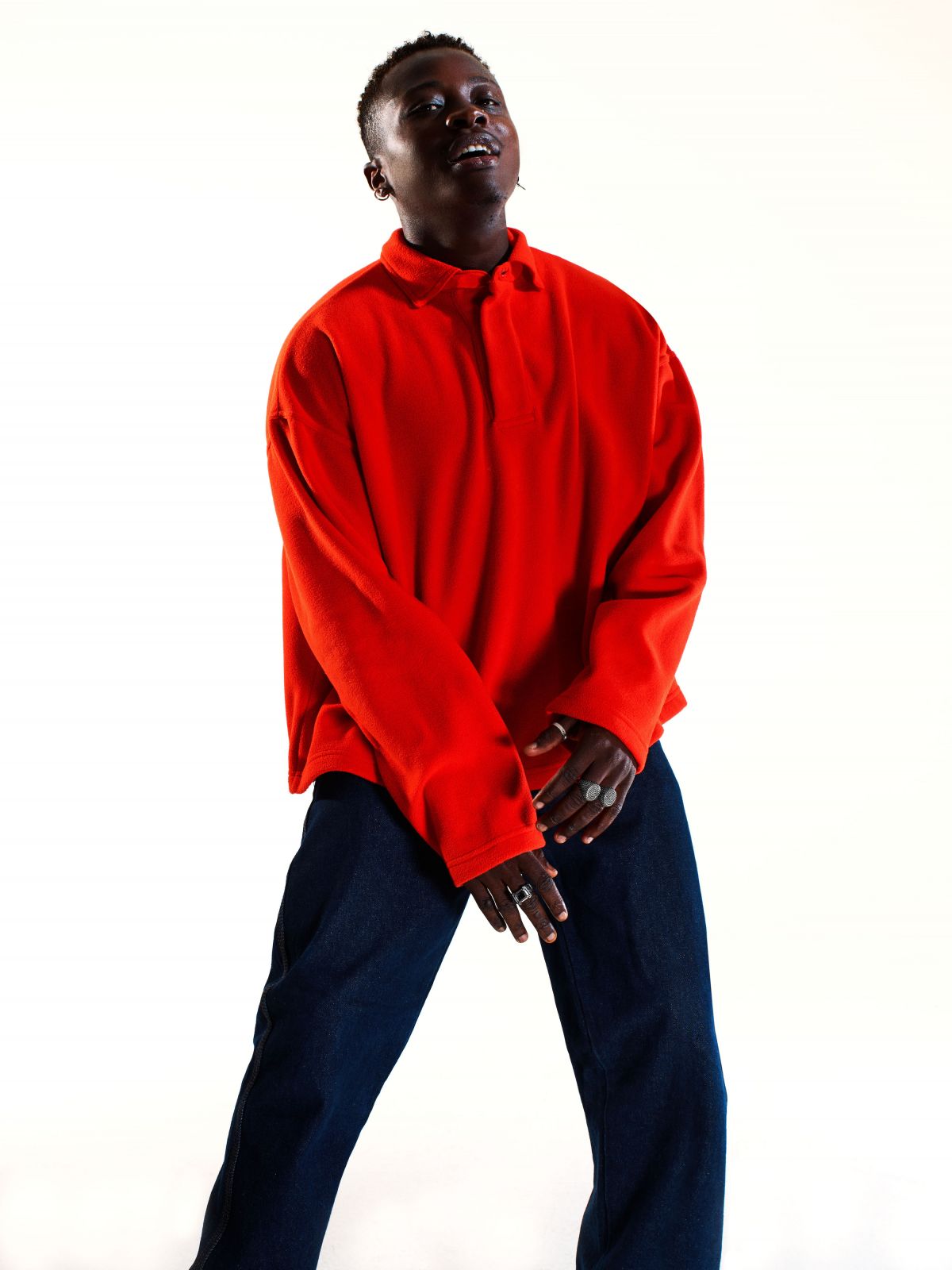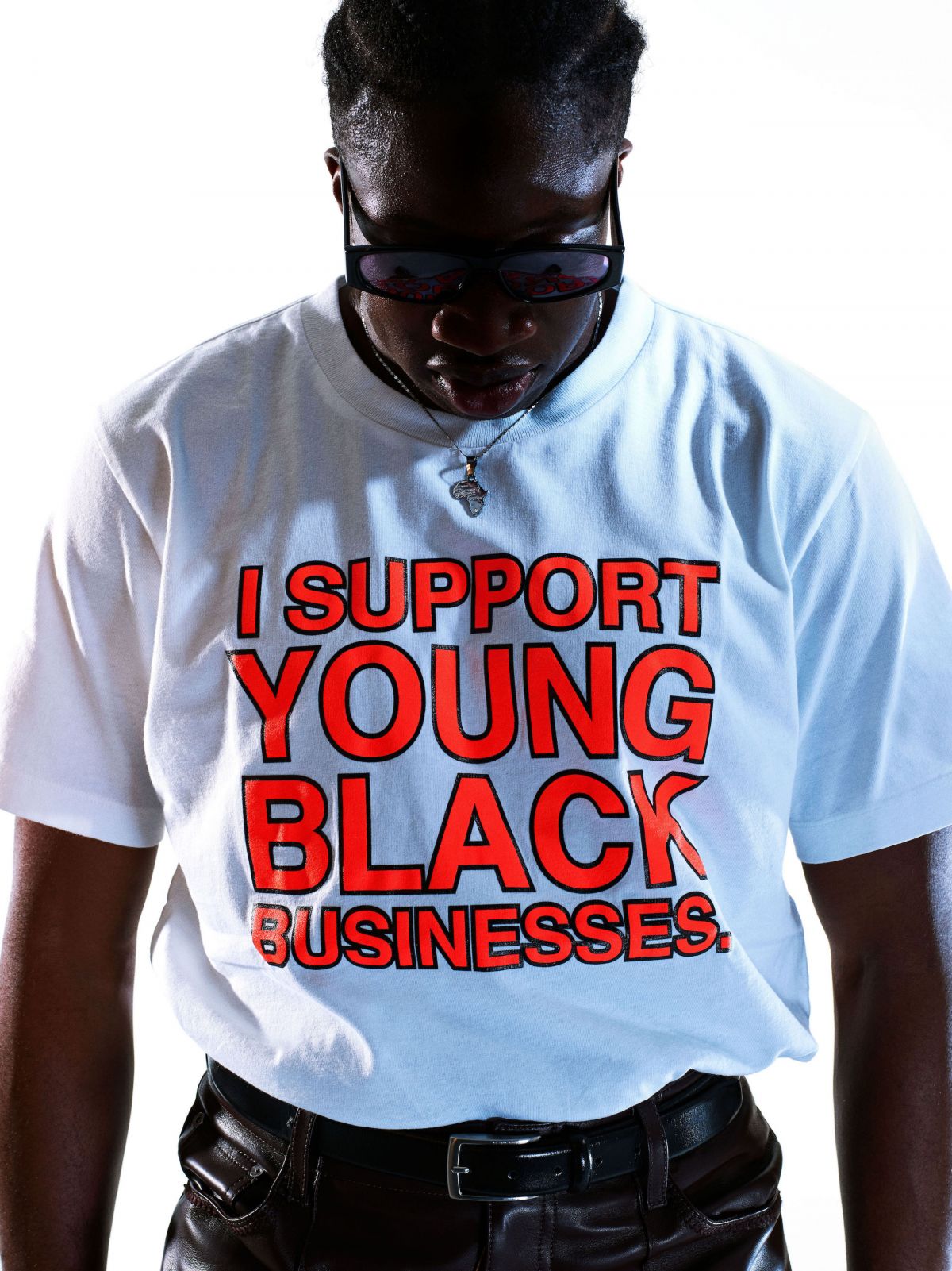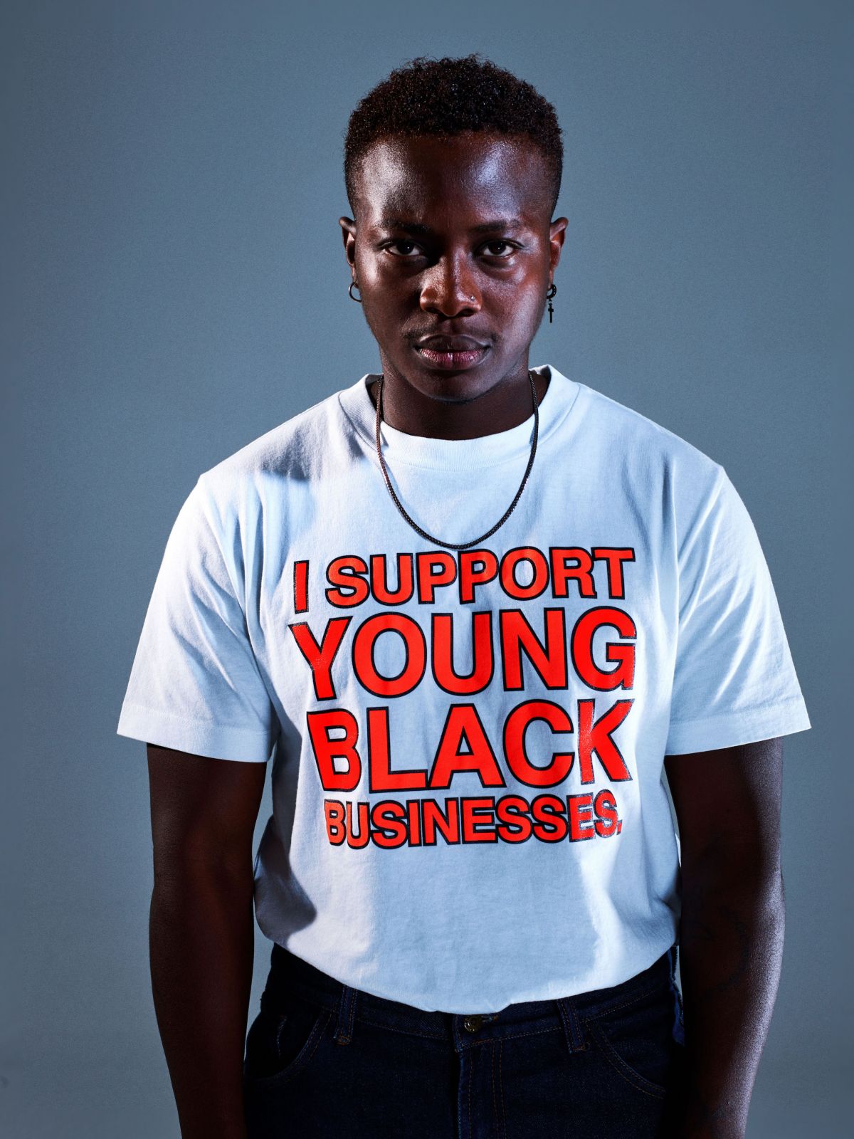 David fa il cantante e il corista. Il 30 aprile è uscito il suo primo singolo, prima ha lavorato con Laura Pausini e, se non ci si fosse messa di mezzo la pandemia, avrebbe girato l’Europa con Mahmood in tournée. Ha vissuto diversi anni a Londra, prima di stabilirsi a Milano. Con gli zii, in Nigeria, non ha più rapporti. Ha un certo magnetismo nella voce, mentre articola le parole lentamente, con un ordine ipnotico. Non è stato facile formarsi una propria identità, spiega, «il David di oggi è ancora un work in progress, molto in progress», dice. Sul set, balla ondeggiando ascoltando una canzone di SZA. Sulla maglietta che indossa la scritta: I Support Young Black Businesses. Lo stesso statement fu indossato a gennaio, prima del lockdown, dal giovane ballerino Carter Williams in una performance che apriva la sfilata Off-White di Parigi. Oggi, mentre continuano le proteste non soltanto in America – Portland, a fine luglio, è solo l’ultima città ad aggiungersi alla lista – suona più adatto che mai. Virgil Abloh, il fondatore di Off-White, ha dato una nuova vita alla campagna decidendo di donare i fondi guadagnati dal lancio al Chicago CRED, un’organizzazione nata per combattere la violenza nelle strade della città natale di Abloh. Non tramite repressione e punizione, ma con un approccio olistico e costruttivo, fatto di prevenzione, counseling, lavoro. In una parola: comunità.