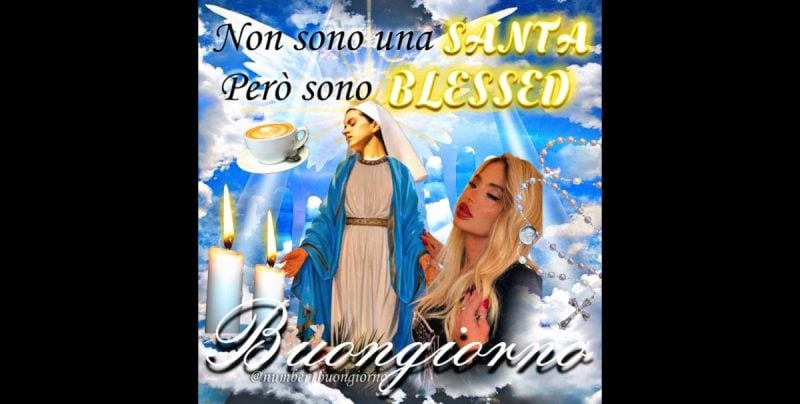 Cielo azzurro, nuvole, candele, tazza di caffè, Rosalia suora e Valeria Marini estasiata: «Non sono una santa, però sono blessed», si legge nel meme.
