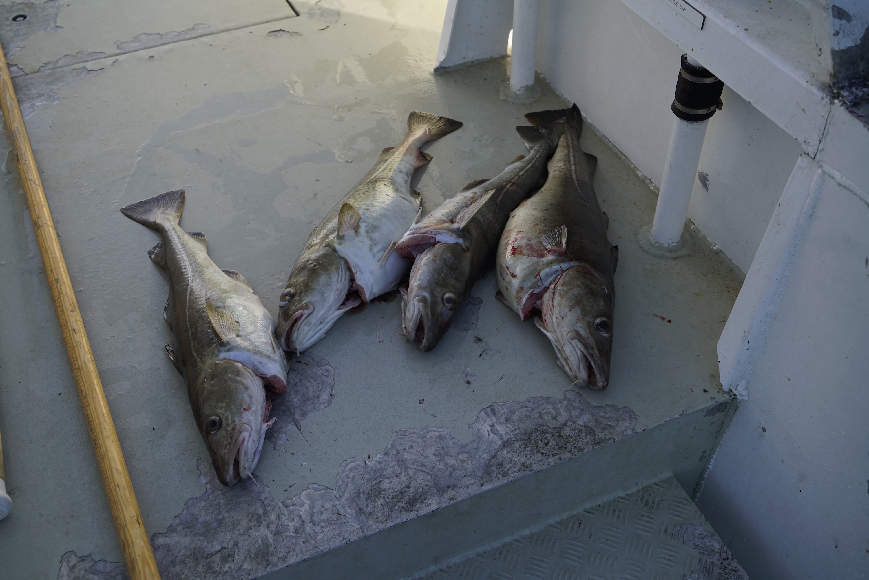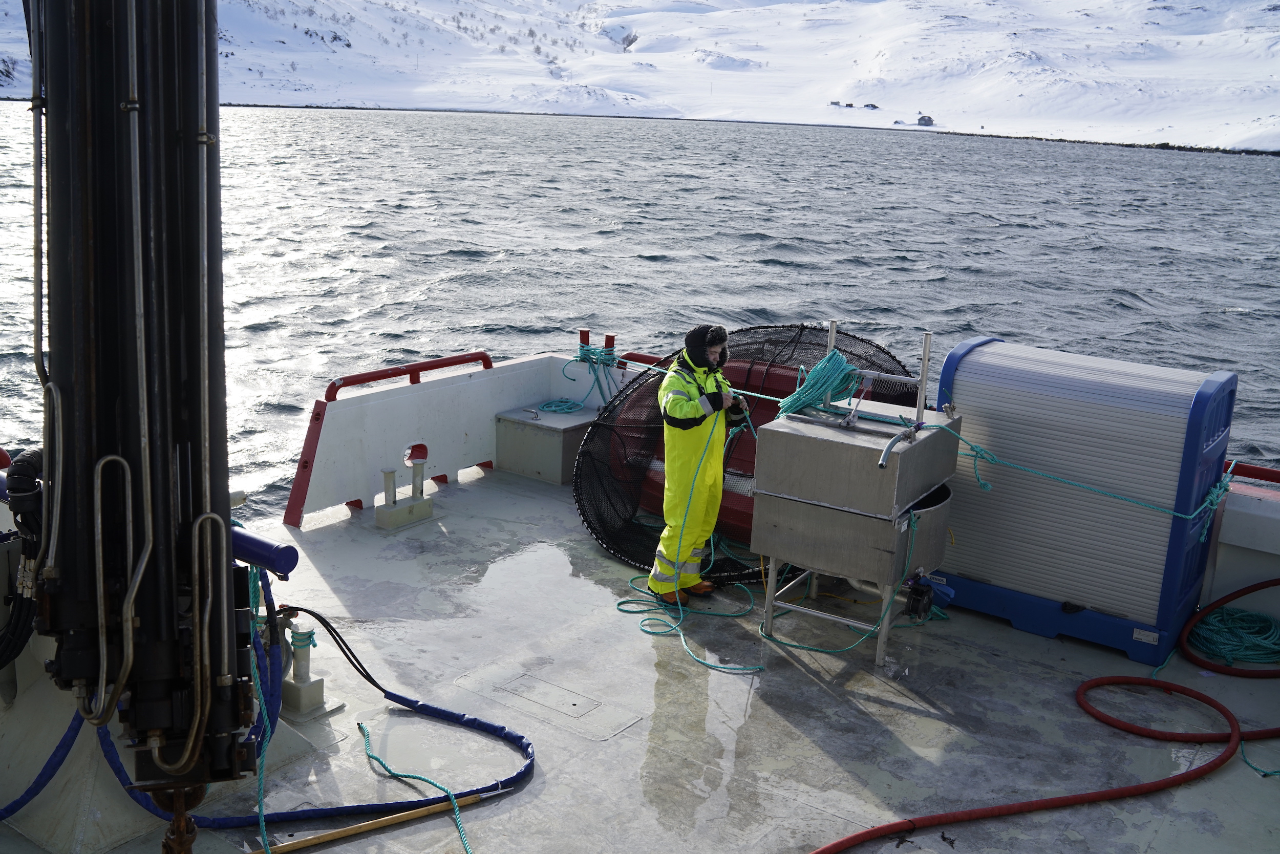 Risalendo per l’unica strada percorribile, mi fermo a un benzinaio, l’unico nel raggio di parecchi chilometri. Alcuni uomini sono ordinatamente in fila in attesa di pagare. Una donna raggomitolata nel suo piumino ha in mano un voluminoso pacco di cartone da spedire. La stazione di servizio funge anche da ufficio postale. Non c’è molto altro attorno: ciò per cui mi trovo qui è ancora fuori dalla mia visuale. Chiedo informazioni. In un inglese risicato, uno degli inservienti mi dice di proseguire fino al termine della strada. Dopo aver aggirato un piccolo promontorio, mi imbatto in un due baite di legno a cui è da poco stata data una mano di vernice bianca. Di fronte, in un piccolo molo, sono ormeggiate due imbarcazioni. Un uomo robusto avvolto in una pelle di renna mi accoglie cordialmente. È Bjorn Millar Angel, il responsabile della filiale e capitano dell’equipaggio. Il pensiero di una compagnia tra le maggiori al mondo, con un utile netto che lo scorso anno ha superato i 100 milioni di euro, mi aveva spinto a immaginare qualcosa di deci-samente più grosso. Bjorn mi offre del filetto di merluzzo e mi presenta al resto della squadra. Sono sei in totale, tutti giovani e pallidi. Vengono da tutta la regione: Alta, Hammerfest, Vardø.