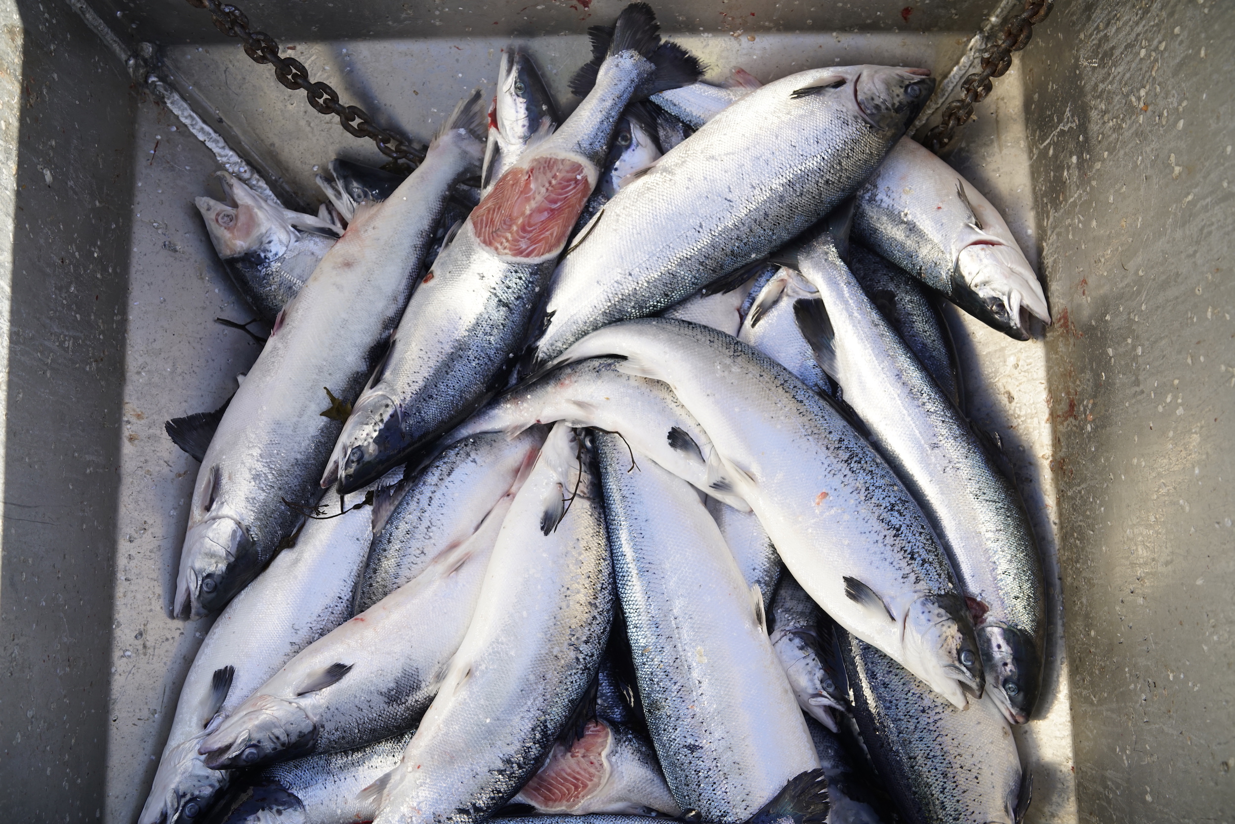 Finita la chiacchierata, ritorniamo in superfcie. Bjorn si accende una sigaretta. Il pomeriggio scorre senza che accada nulla. «È quasi sempre così», mi confida uno dei ragazzi agli ordini di Bjorn. All’imbrunire facciamo rotta verso la base. Il resto della settimana procede senza impedimenti, scandito dalla routine. Con il passare del tempo mi sembra sempre più chiaro che il rinnovamento a cui si è sottoposta l’intera industria del salmone norvegese non è una semplice operazione di maquillage. Rispetto ai primi anni 2000, quando l’uso di antibiotici era ancora ampiamente diffuso e i livelli di igiene erano lontani dagli standard attuali, gli allevamenti hanno alzato notevolmente il livello qualitativo, nonostante la produzione sia passata da 50 mila tonnellate a quasi un milione e mezzo l’anno.