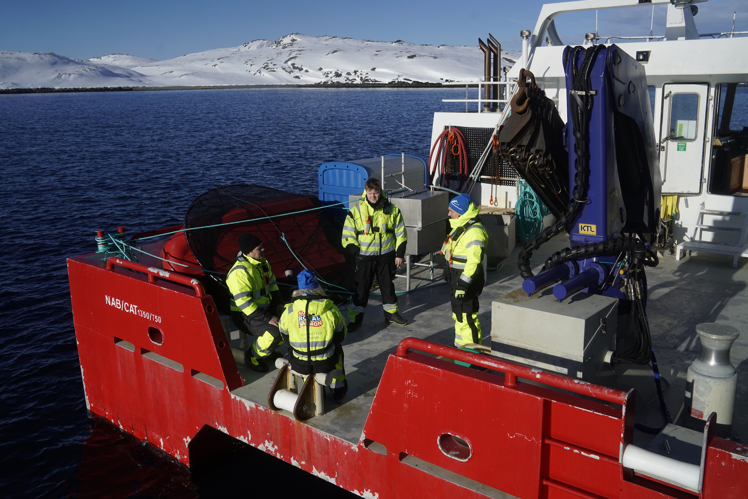 La mattina seguente la sveglia è alle cinque. Dopo una colazione veloce, uno dei ragazzi mi porge una spessa tuta giallo evidenziatore, poi saliamo sulle imbarcazioni ormeggiate di fronte al complesso e navighiamo verso l’allevamento, che dista alcuni chilometri. Ci dividiamo in due gruppi. Ogni squadra si dirige verso una delle due postazioni che compongono la struttura. Insieme a Bjorn e altri tre, ci addentriamo in un’insenatura larga e profonda. Sullo sfondo si scorgono ampie gabbie circolari, segnalate da sgargianti boe rosse. Ogni postazione dispone di sei gabbie il cui diametro può variare dai 60 ai 160 metri e profonde alcune decine di metri. Ogni gabbia può contenere fino a 200 mila salmoni. Il loro ciclo di vita dura circa tre anni.