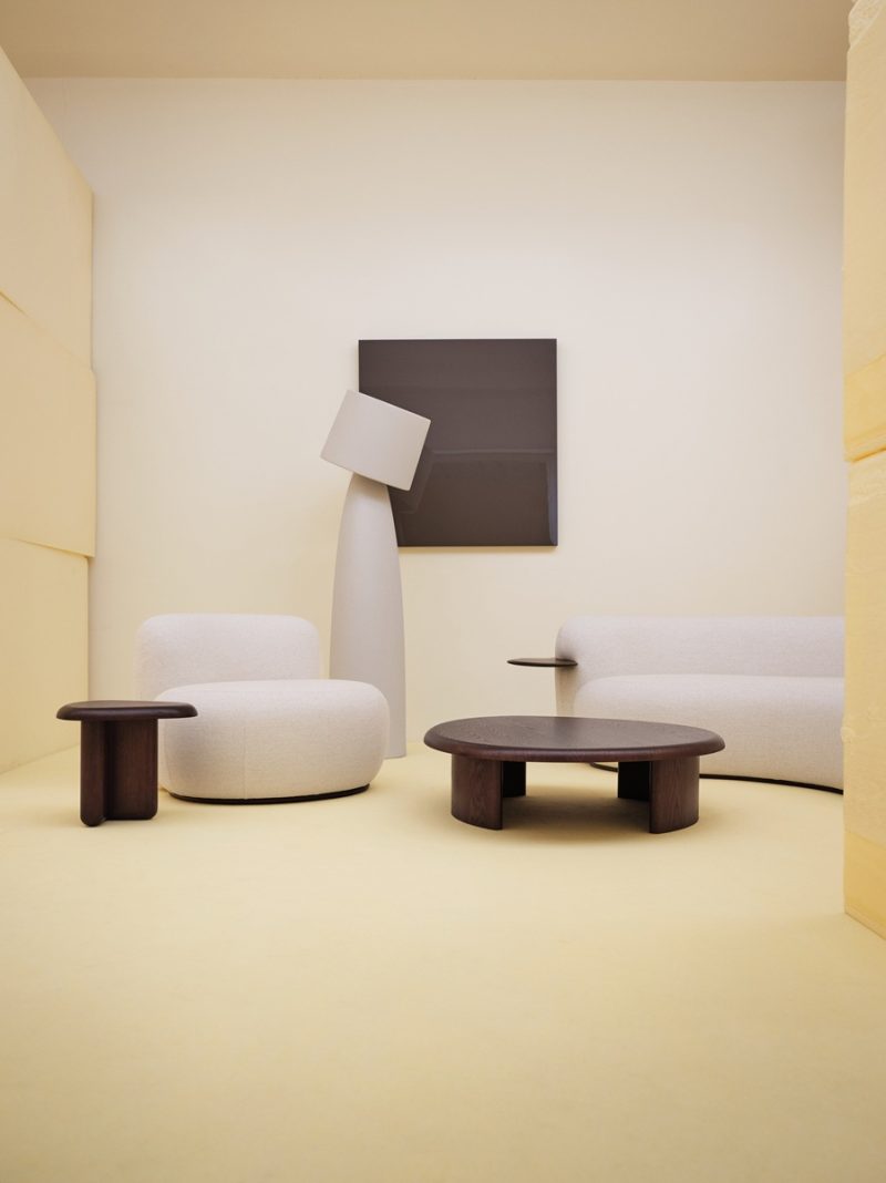 E infatti Soft Matters non è una mediazione tra due mondi. È piuttosto una loro accelerazione, da una parte, la solidità produttiva di Secolo, il controllo, la manifattura, la precisione, dall’altra, l’approccio intuitivo e sperimentale di TABLEAU. Il punto di incontro non è una sintesi ordinata, ma qualcosa di più instabile, un progetto che cambia strada mentre lo si fa. Come raccontano loro, si è partiti con l’idea di intervenire su alcuni prodotti esistenti, poi sono arrivati nuovi pezzi, poi l’allestimento, poi la grafica, fino a trasformare tutto in una narrazione coerente, o meglio, in un’esperienza. La parola chiave del progetto è “riconnessione”, che potrebbe suonare come l’ennesima formula vuota, se non fosse che qui viene presa alla lettera. Riconnettersi agli oggetti, ma in modo fisico, tattile. Riconnettersi agli altri creando spazi che favoriscono l’incontro. Riconnettersi a una parte più istintiva lasciando spazio al gesto, all’errore, al gioco.