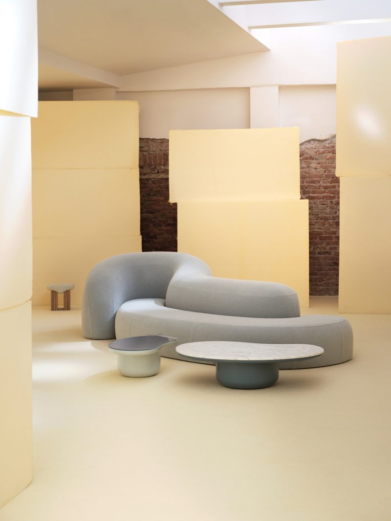 Ma soprattutto, è un dispositivo relazionale. Durante l’installazione, lo stesso gesto viene replicato collettivamente, il team, i collaboratori, le persone coinvolte sono invitate a disegnare. Il pattern non è più solo decorazione, diventa traccia di una partecipazione. Un modo per creare connessione, non a livello teorico, ma letteralmente, attraverso un segno condiviso. Tra i pezzi chiave del progetto emerge anche Trace, il divano disegnato da TABLEAU. È grande, avvolgente, volutamente fuori scala. Ma soprattutto non è pensato per essere guardato frontalmente, non ha un “lato giusto”, si muove, o meglio, invita al movimento. Puoi sederti ovunque, attraversarlo, usarlo come punto di incontro più che come oggetto. È, nelle parole di Julius Værnes Iversen, qualcosa che ha a che fare con la percezione più che con la funzione, una sensazione di fluttuazione, di perdita del tempo.