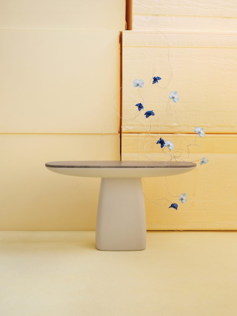 L’ingresso nello spazio è quasi spiazzante. Blocchi di schiuma, scarti di produzione, superfici morbide che diventano architettura, non è una scenografia neutra, non è un white cube. È qualcosa di più vicino a un paesaggio, artificiale, certo, ma anche sorprendentemente fisico. L’idea, come raccontano, è portare dentro lo spazio tutto quello che di solito resta fuori: il processo, il materiale grezzo, la parte meno “presentabile” del design, e trasformarla in esperienza. Ed è qui che entra in scena TABLEAU. Il loro contributo non è solo formale ma quasi metodologico, lavorare sull’istinto, sull’errore, sull’apertura. Il caso più evidente è la reinterpretazione del side table Pingu, decorato con pattern floreali realizzati attraverso la tecnica del blind drawing, una pratica che consiste nel disegnare senza guardare il foglio, lasciando che sia la mano a muoversi in autonomia, senza il controllo dell’occhio. Un gesto che sembra infantile, quasi banale, ma proprio per questo radicale.