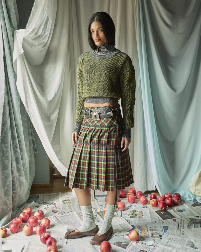Mentre i grandi brand sono impegnati a cercare di svelare i misteri del mondo e dell’iperuranio, i giovani brand «touch grass», per dirla all’inglese. In altre parole, affrontano problemi concreti, quotidiani e, soprattutto, urgenti. Si misurano con le conseguenze presenti e future delle scelte delle generazioni passate e con problemi spesso ben più grandi di loro, con energia propositiva, entusiasmo, a volte con rabbia e ribellione. Reazioni umane, viscerali e coinvolgenti che si riflettono nelle scenografie delle presentazioni, nei suoni che accompagnano le sfilate e, per ultimo nei capi realizzati.