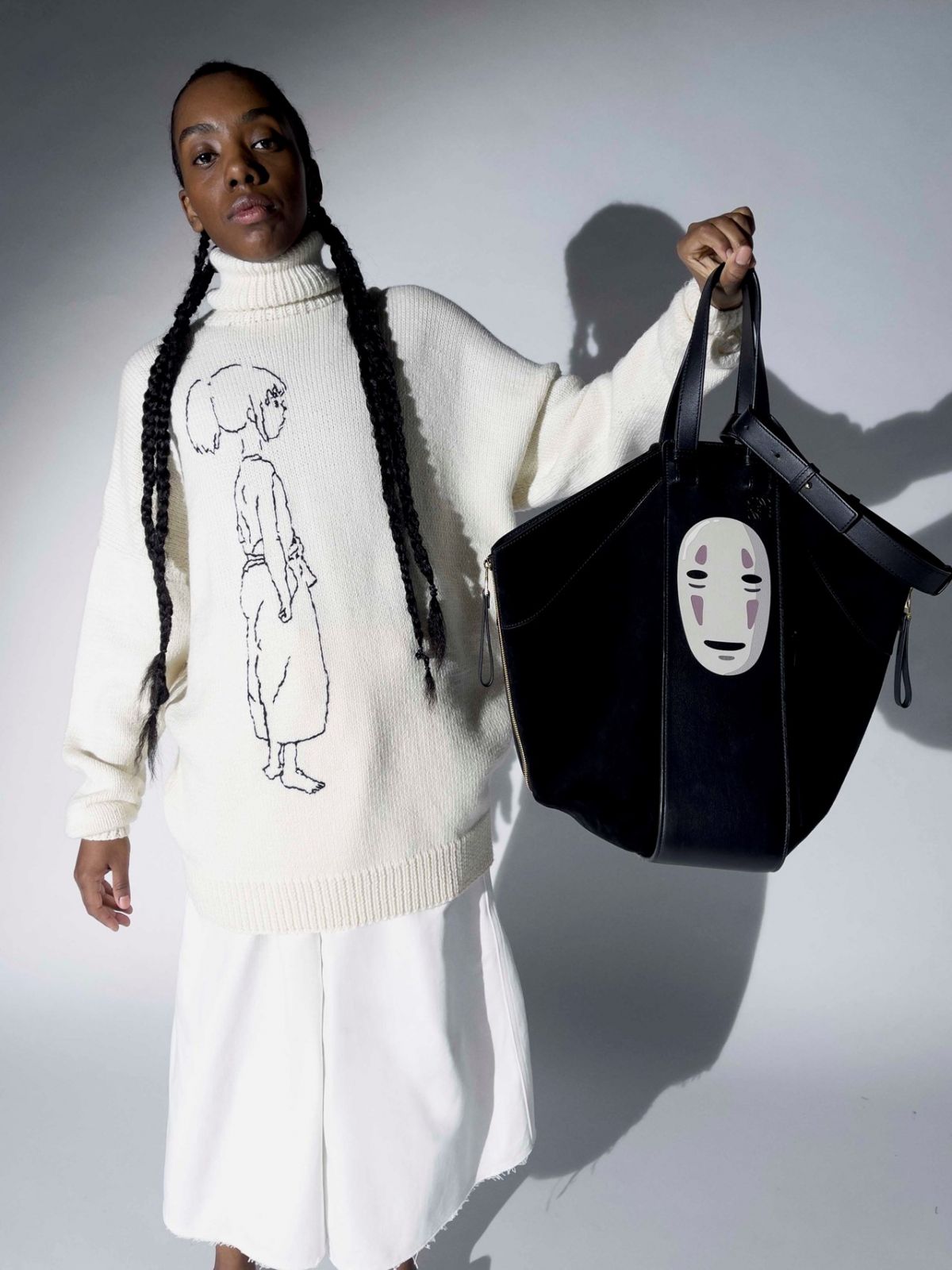 Il secondo capitolo frutto della collaborazione tra Loewe e il venerato Studio Ghibli (soprattutto da quando ben 21 film realizzati da Miyazaki e Isao Takahata sono approdati su Netflix, ne parlavamo qui ), è dedicato a Spirited Away, conosciuto in Italia col titolo La città incantata, arriva esattamente un anno dopo. I volti più riconoscibili del film – Chihiro, Yubaba e Kaonashi – decorano borse di pelle, maglieria, coperte e t-shirt. I paesaggi bucolici sono stati trasformati in stampe all-over, mentre i nerini del buio (piccoli spiriti a forma di palline di fuliggine che in giapponese si chiamano susuwatari) decorano borse e borsette. I capi della collezione saranno disponibili dal 7 gennaio e le fotografie della campagna sono state realizzate da Juergen Teller. Così Loewe ha presentato la collezione: «Il mondo fantasy è una magnifica fuga. È una realtà parallela in cui tutti possono imparare qualcosa nei modi più sinceri e appaganti e presso la casa di animazione giapponese Studio Ghibli sono dei veri specialisti del fantasy. Per la nostra seconda collaborazione, abbiamo creato una capsule collection che celebra uno dei film più acclamati dello studio, Spirited Away, l’epopea animata del 2001 che ha assicurato al regista Hayao Miyazaki e allo Studio Ghibli numerosi premi, tra cui l’Oscar come miglior film d’animazione alla 75° edizione degli Academy Awards. Il film è un inno alla lealtà, all’amicizia e all’ostinazione di fronte alle avversità. È magico».