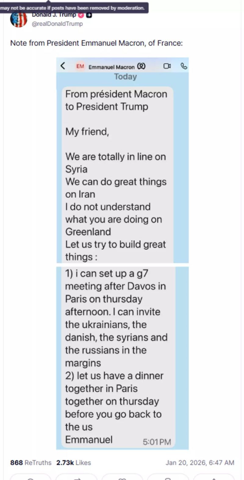 France24 riporta gli screenshot pubblicati dal Presidente statunitense, che fonti vicine a Macron hanno confermato essere autentici. «Siamo assolutamente d’accordo sulla Siria, in Iran possiamo fare grandi cose, non capisco cosa vuoi fare in Groenlandia», scrive Macron a Trump, prima di proporgli una riunione giovedì 22 gennaio «con gli ucraini, i danesi, i siriani e i russi» e il resto dei Paesi del G7 a Parigi, e poi una cena, sempre a Parigi, sempre giovedì, prima del ritorno di Trump a Washington. Non sappiamo come quest’ultimo abbiamo risposto alle proposte di Macron.