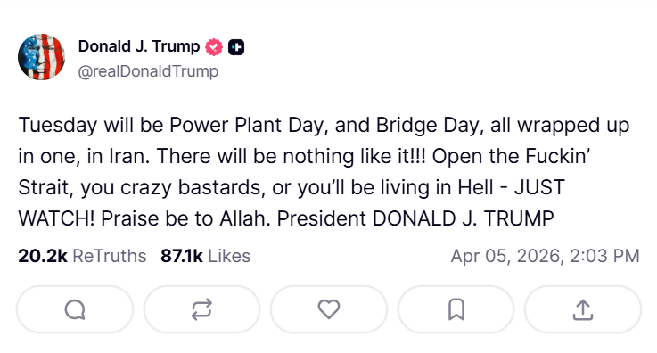 Ormai geopolitica e diplomazia hanno definitivamente abbandonato i corridoi felpati delle cancellerie per trasferirsi nel perimetro incendiario di Truth Social, e poi a cascata, in quello tutti gli altri invadendo i vari feed di «crazy bastard», «living in Hell» e «open the fuckin’ Strait». L’ultimo ultimatum di Donald Trump contro Teheran trasforma la crisi dello Stretto di Hormuz in un atto di forza mediatica senza filtri: una scadenza fissata per stasera, martedì 7 aprile alle ore 20 (fuso della costa orientale, per l’Italia le ore 20), oltre la quale il Presidente minaccia di trasformare l’Iran nel bersaglio di un’offensiva senza precedenti, distruggendo centrali elettriche e infrastrutture civili. Riportiamo qui una traduzione in italiano del post di Trump, scusandoci per la volgarità di certe espressioni ma sottolineando che non sta a noi censurare una dichiarazione del Presidente degli Stati Uniti d’America: «Martedì (oggi, ndr) sarà la Giornata della Centrale nucleare e la Giornata del Ponte, tutto in un giorno soltanto, in Iran. Sarà una cosa mai vista!!! Aprite quel Cazzo (usiamo la c maiuscola perché in originale Trump ha scritto Fuckin’ con la f maiuscola, ndr) di Stretto, pazzi bastardi, o vi ritroverete all’Inferno – STATE A GUARDARE! Sia lodato Allah. Presidente Donald J. Trump».